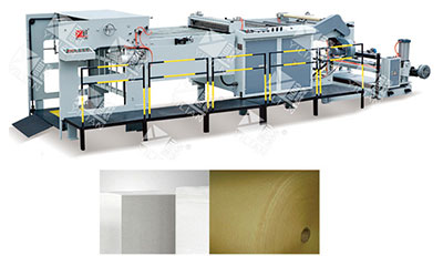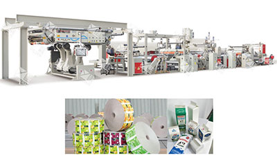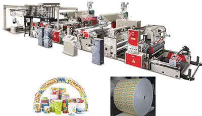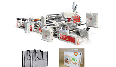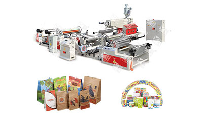 复合淋膜机 整机由加料装置、挤出机主机、模具、放卷机构、复合机构、收卷机构、边位控制装置、切边装置、加热冷却系统、电气测控系统等部分组成。根据不同制品需要可添加第二放卷机构、印刷设备、烘箱、基材表面处理装置、在线测厚仪等组成部分。