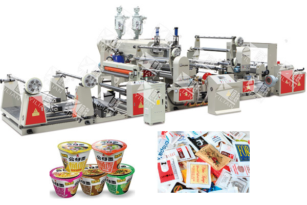 本系列设备以纸,塑膜,纺织布或铝箔为基材,通过流延,一次复合成二层,三层(夹心复合),广泛应用于食品包装,药品包装等各行业。如制作口杯,方便面碗,饲料包装袋,医用卫材,快餐盒,无纺布袋。PLC人机界面集中控制,机