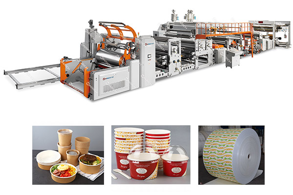 WSFM型淋膜机是一款绿色环保机型,其工艺原理是塑料粒子(PE/PLA/PBS/EVA等)经螺杆塑化后由平模头模口成线型挤出,拉伸后附着于纸张表面, 经冷却定型压合后,使纸张具有防水防油防渗,热封等功能